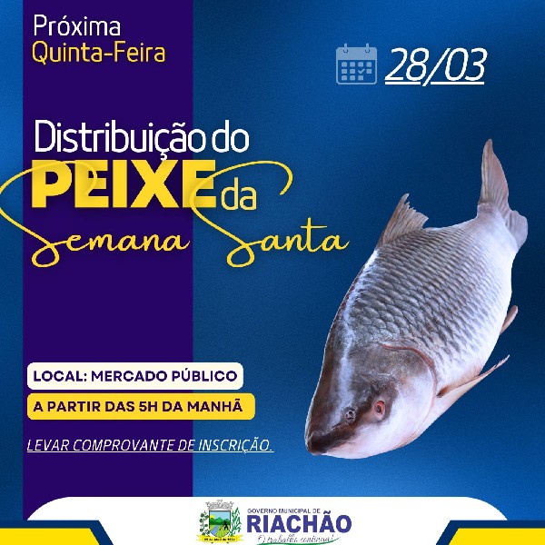 A prefeitura municipal de Riachão/PB, através da Secretaria de Assistência Social, dará início ao cadastramento para a tradicional entrega do peixe na semana santa, a partir do dia 11/03 ao dia 14/03, de segunda a